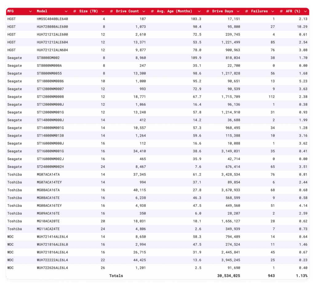 По состоянию на конец 2025 года компания Backblaze отслеживала 349 462 жестких диска, используемых для хранения данных. Мы исключили из рассмотрения 4176 загрузочных дисков и 1090 жестких дисков, поскольку они не соответствовали определенным нами годовым критериям. Таким образом, у нас осталось 344 196 дисков, распределенных по 30 различным моделям. В таблице ниже показаны годовые показатели использования (AFR) за 2025 год для этой группы дисков.