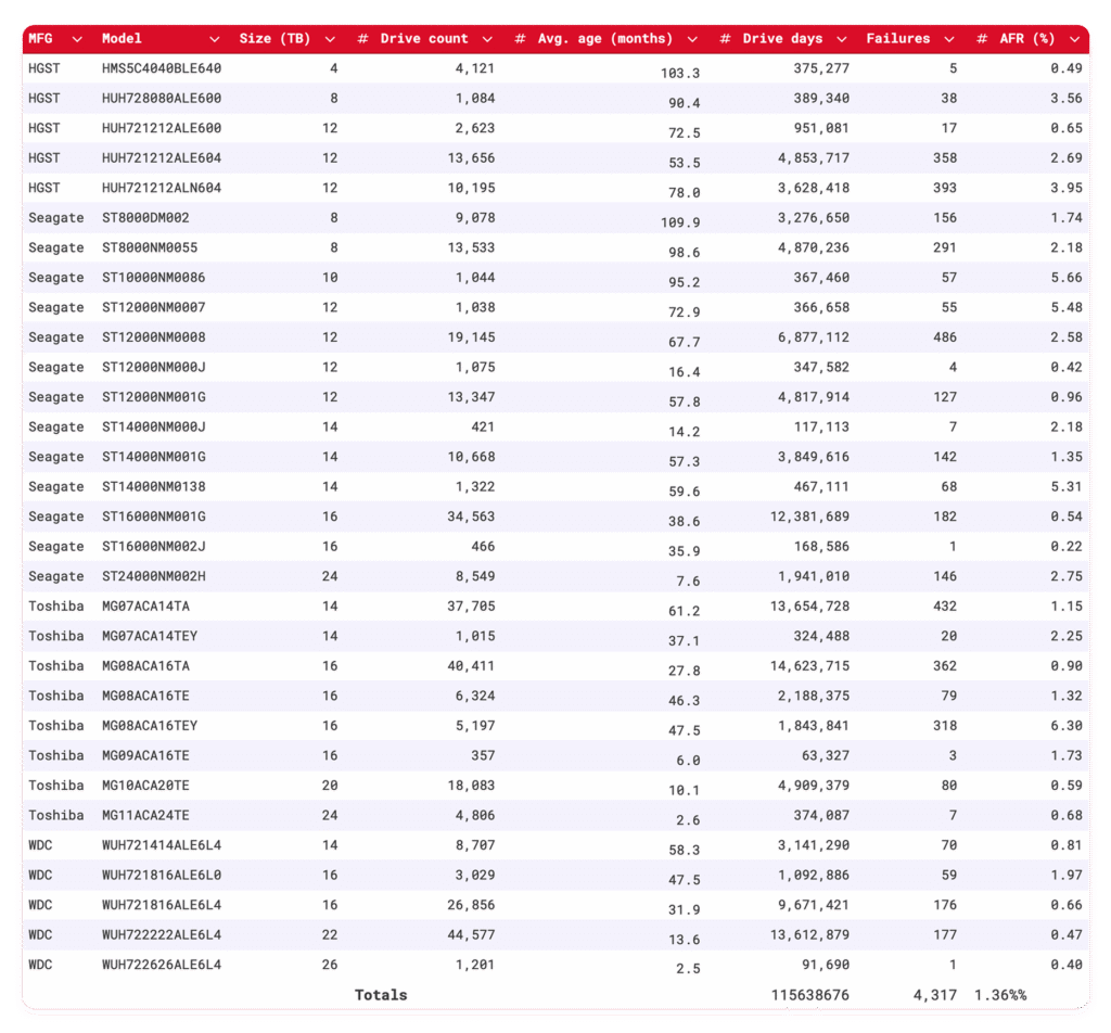 По состоянию на конец 2025 года компания Backblaze отслеживала 341 664 диска, используемых для хранения данных. Для нашей оценки мы исключили из рассмотрения 4013 загрузочных дисков и 459 жестких дисков, поскольку они не соответствовали критериям включения. Критерии, которые мы использовали, будут рассмотрены в следующем разделе этого отчета. После исключения этих дисков для анализа осталось 337 192 жестких диска. В таблице ниже показаны годовые показатели отказов за 4 квартал 2025 года для этой группы дисков.