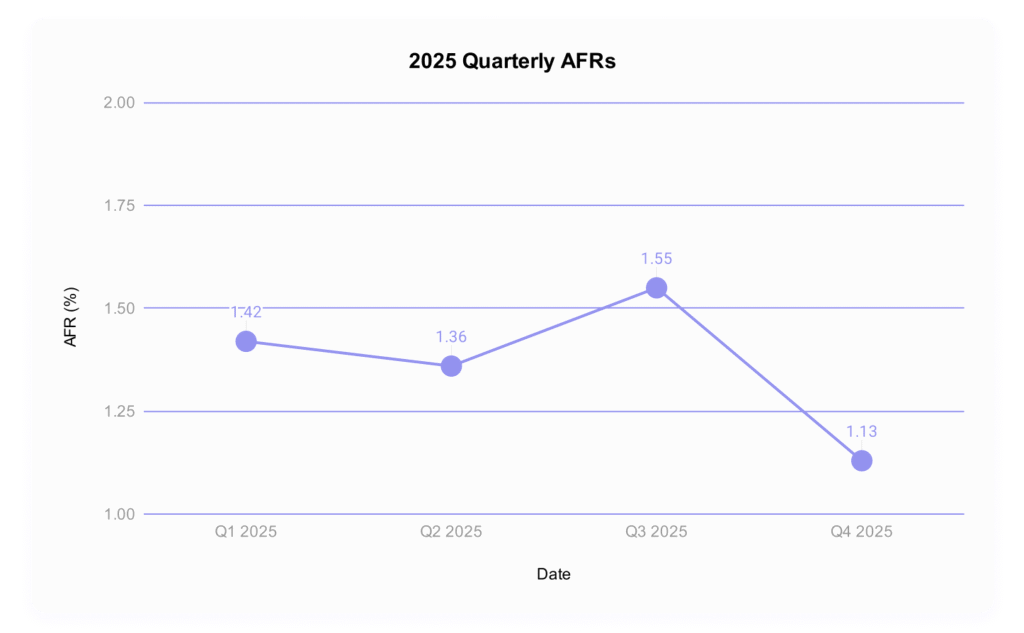 Годовой показатель AFR снизился: в этом году он завершился на высоком уровне в 1,36%, что ниже показателя 1,55% в 2024 году. Тем не менее, те, кто следит за квартальным показателем AFR, отмечают некоторую волатильность этого числа.