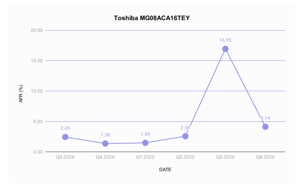 Мы обсуждали эту модель в прошлом квартале, потому что она показала показатель AFR в 16,95% (!!). Наше расследование выявило совместную (и плановую) работу по обновлению прошивки с Toshiba, и тогда мы предсказали, что эти показатели отказов снова нормализуются. Мы все еще немного завышены, но это, вероятно, результат внедрения обновленной прошивки. Как и предсказывалось, это здоровая нормализация.