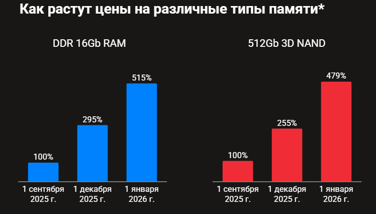«Еще в сентябре 2025 года средняя цена на 16-гигабитный чип памяти DDR5, по данным DRAMeXchange, составляла $6,84. Три месяца спустя она выросла до $26,4, то есть почти в четыре раза. Розничные цены на модули памяти для потребительских компьютеров увеличились пропорционально: если в сентябре популярный набор на 32 ГБ памяти стоил в российской рознице менее 10 000 рублей, то к концу года его цена составляла 45 000 рублей», — писал в январской колонке для Forbes партнер Capital Lab Евгений Шатов.