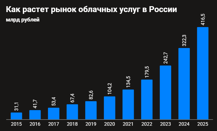 Как ранее оценивали аналитики iKS-Consulting, объем российского рынка облачных инфраструктурных сервисов в 2025 году мог вырасти на 29,2%, до 416,5 млрд рублей, а к 2030-му он может и вовсе достичь отметки 1,2 трлн рублей.