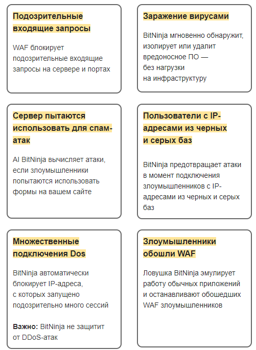 • Важно: BitNinja не защитит от DDoS-атак. Здесь поможет модуль DDoS-Guard