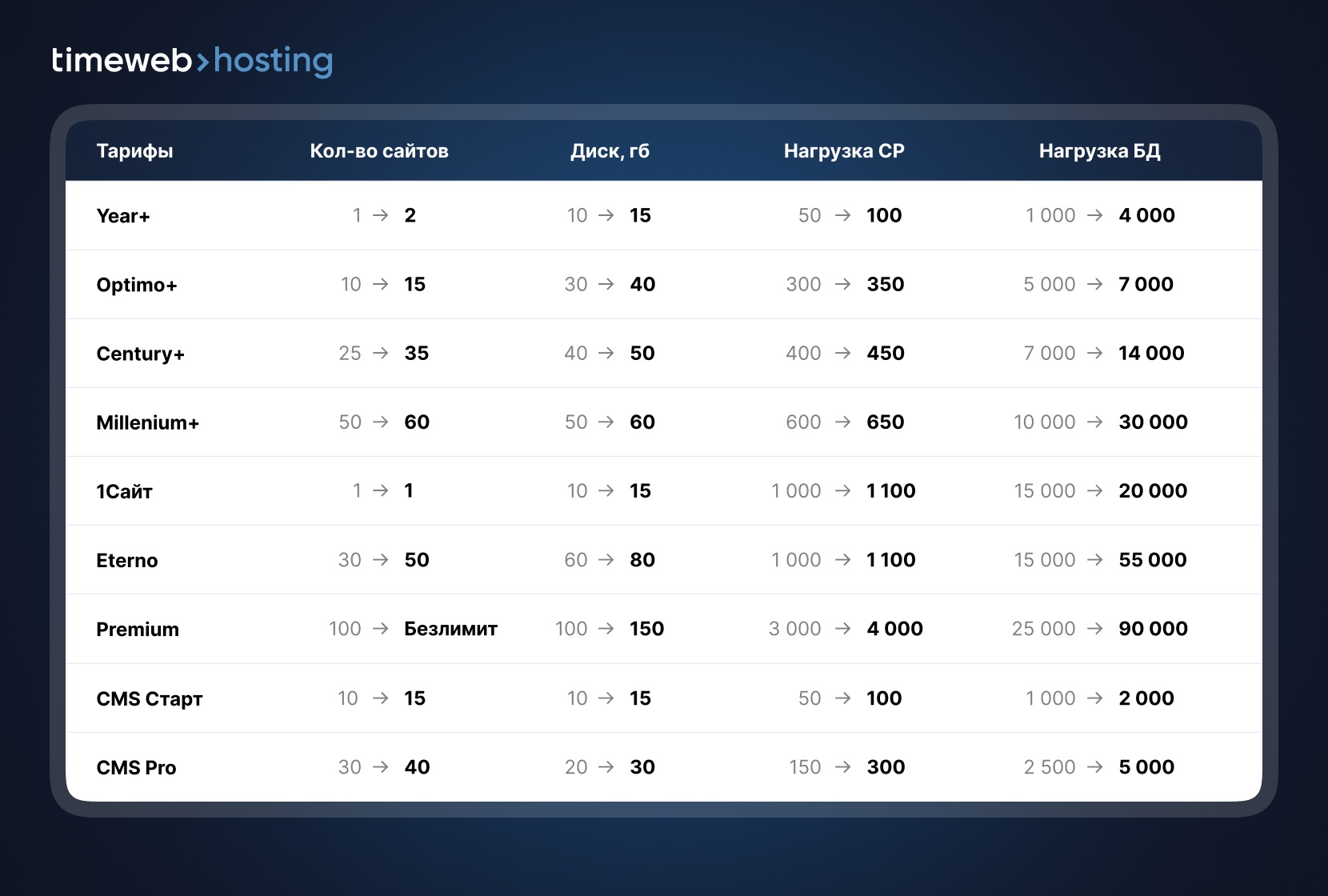 • Увеличились количество сайтов – это значит, что вы сможете перенести к нам еще больше своих сайтов, или создать новые без смены тарифа на более дорогой.