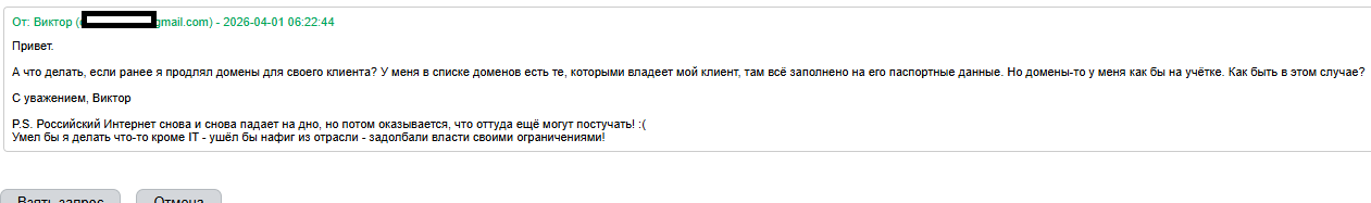 А что делать, если ранее я продлял домены для своего клиента? У меня в списке доменов есть те, которыми владеет мой клиент, там всё заполнено на его паспортные данные. Но домены-то у меня как бы на учётке. Как быть в этом случае?