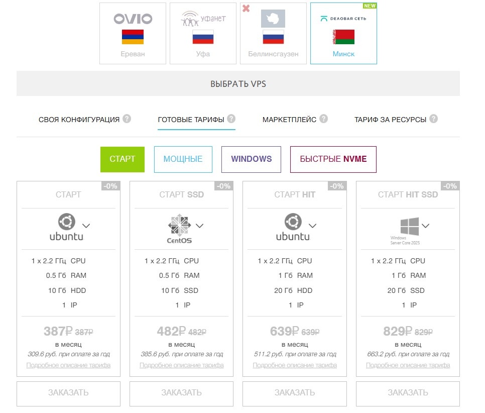 Прямо сейчас тарифы по данным сайта доступны, а вот заказ оформить на них низя — предлагает только по конфигуратору.