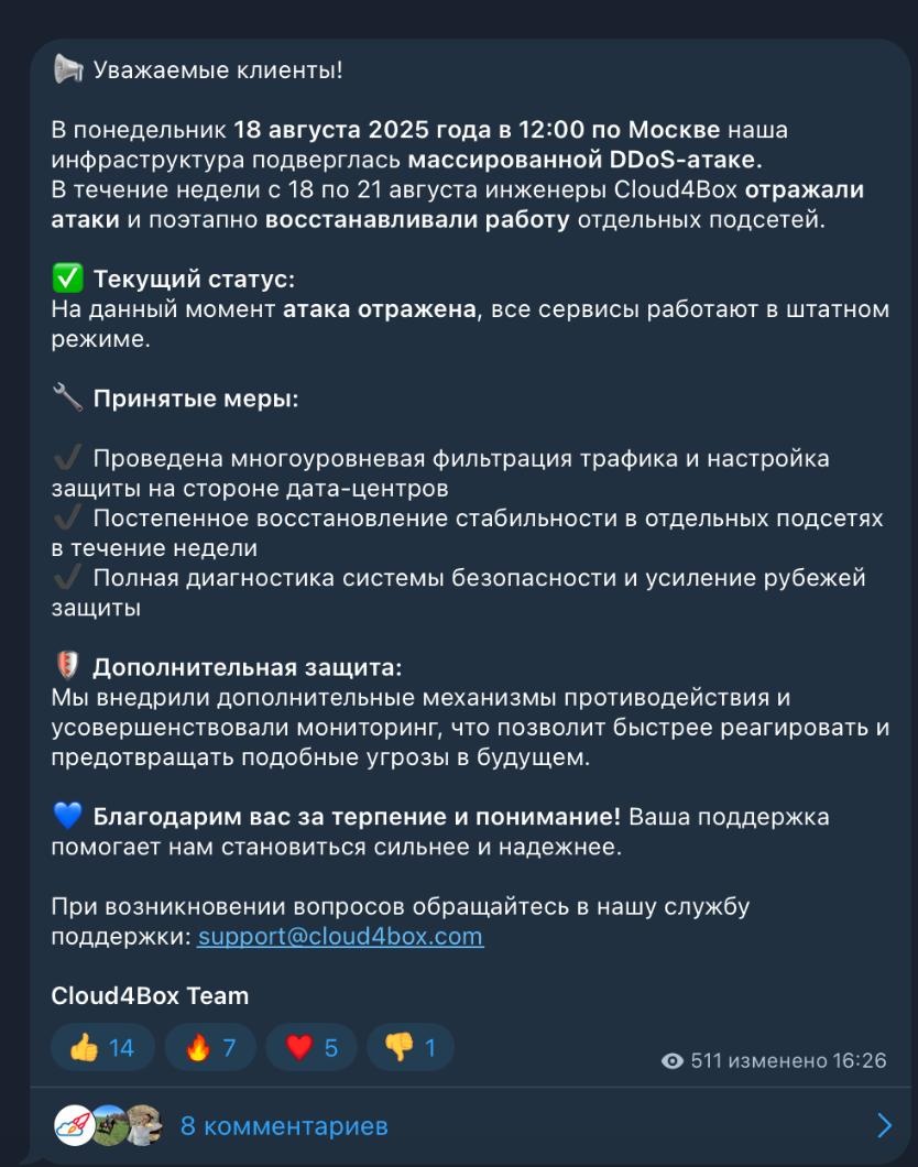 Коммуникация и ожидания клиентов — человеческий фактор. У саппорта ограниченные ресурсы. Клиенты часто требовали немедленного индивидуального решения, но это невозможно при одновременной атаке на десятки сервисов. При этом Cloud4box работали круглосуточно и публиковали обновления по ситуации. К сожалению, часть клиентов всё равно расторгла контракты. Это нормальная, но неприятная часть риска.