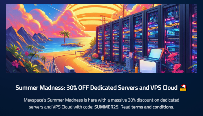 Летнее безумие: скидка 30% на выделенные серверы и VPS Cloud Mevspace.com Хостинг 14 июля 2025, 13:59 mevspace.com/summer-madness
