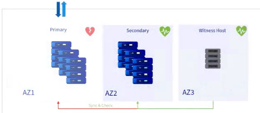 - Репликация данных между двумя площадками Paris 3AZ (третья площадка используется в качестве свидетельской) с использованием отказоустойчивости хранилища vSAN ESA в зонах доступности.