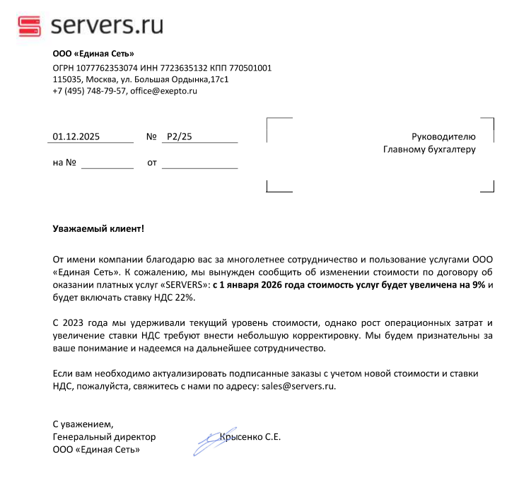 Уважаемый клиент, благодарим вас за многолетнее сотрудничество и пользование услугами ООО «Единая Сеть». К сожалению, вынуждены сообщить об изменении стоимости по договору об оказании платных услуг «SERVERS»: с 1 января 2026 года стоимость услуг будет увеличена на 9% и будет включать НДС по ставке 22%.