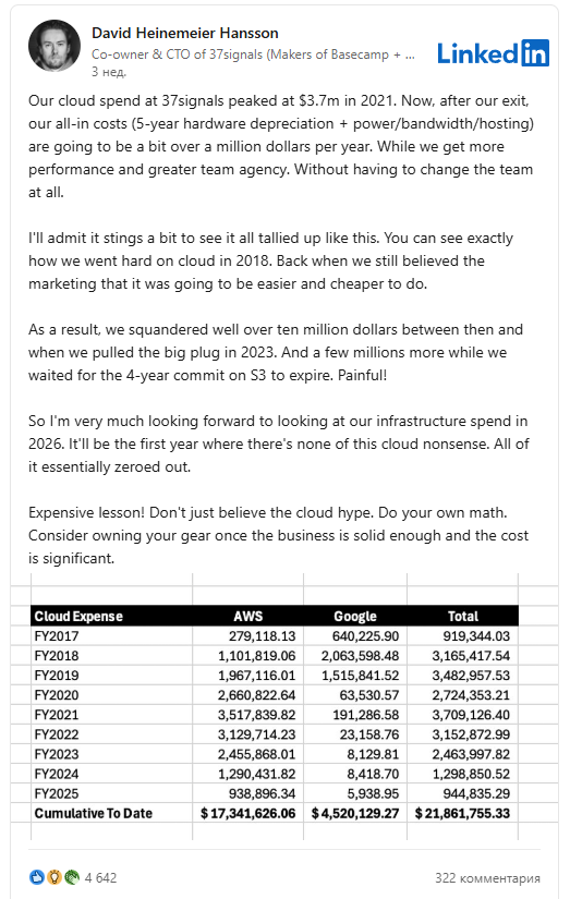 В недавнем посте, посвященном расходам компании на облачные технологии в период с 2017 по 2025 год, Ханссон пишет: «С того момента и до момента окончательного закрытия облачных сервисов в 2023 году мы потратили более десяти миллионов долларов».