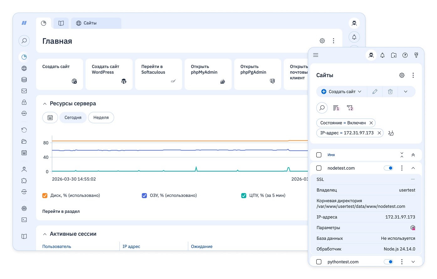 • Централизованное управление из единого интерфейса (веб-сайты, домены, почтовые ящики, базы данных и т.д.)
