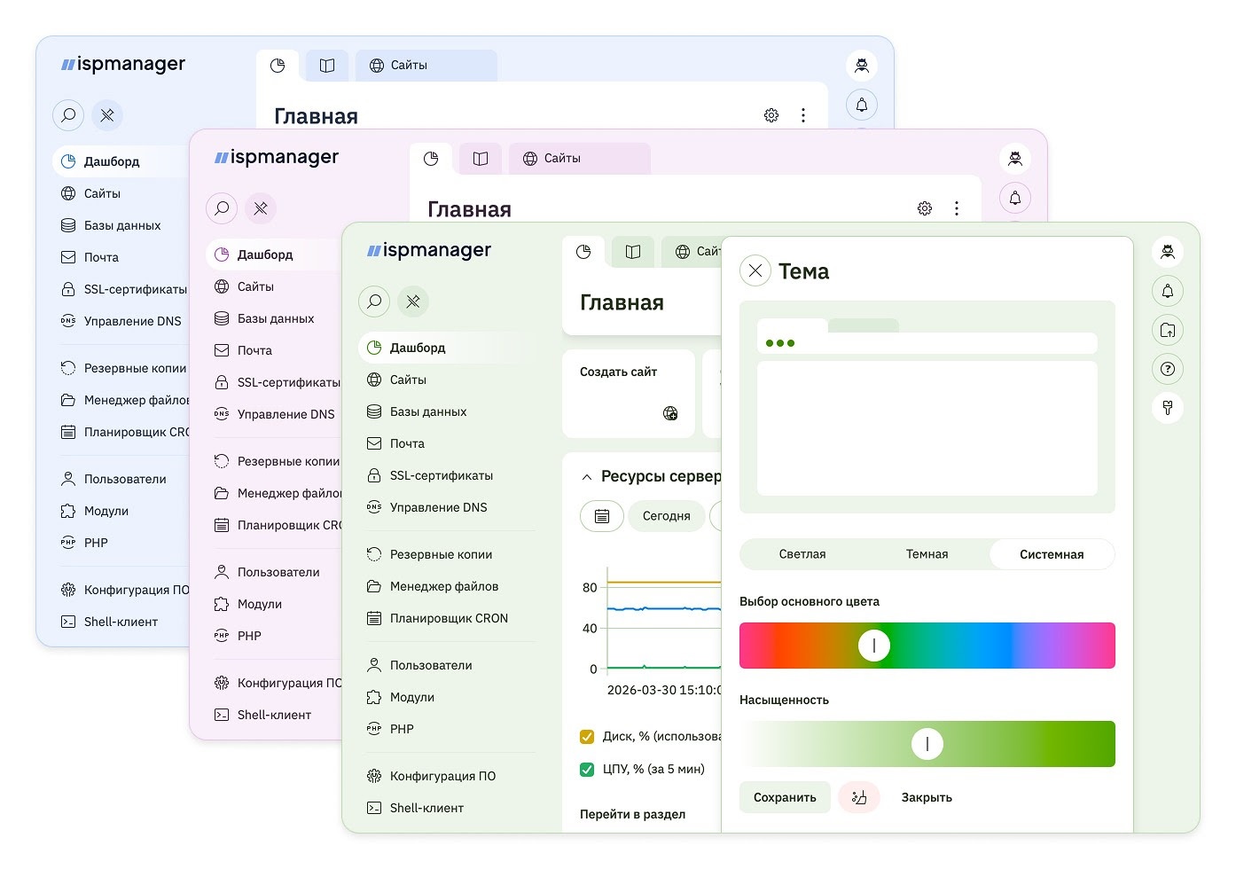 Обновлённый ispmanager корректно работает на устройствах с любым разрешением экрана. Смартфон, ноутбук или большой монитор — панель автоматически подстраивается под используемый формат.