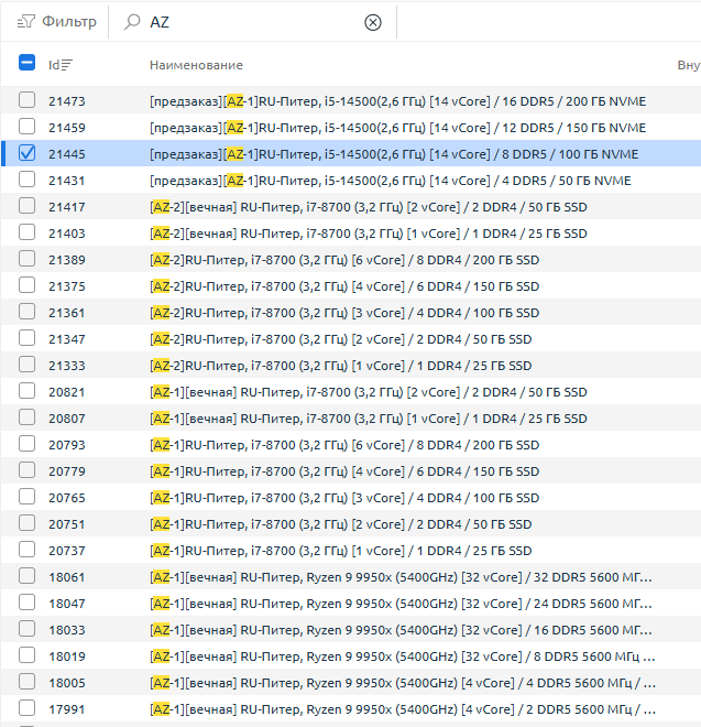 - Питер — SPB-2 SPB-4 — две разные зоны доступности, AZ-1 AZ-2 в тарифах помечены